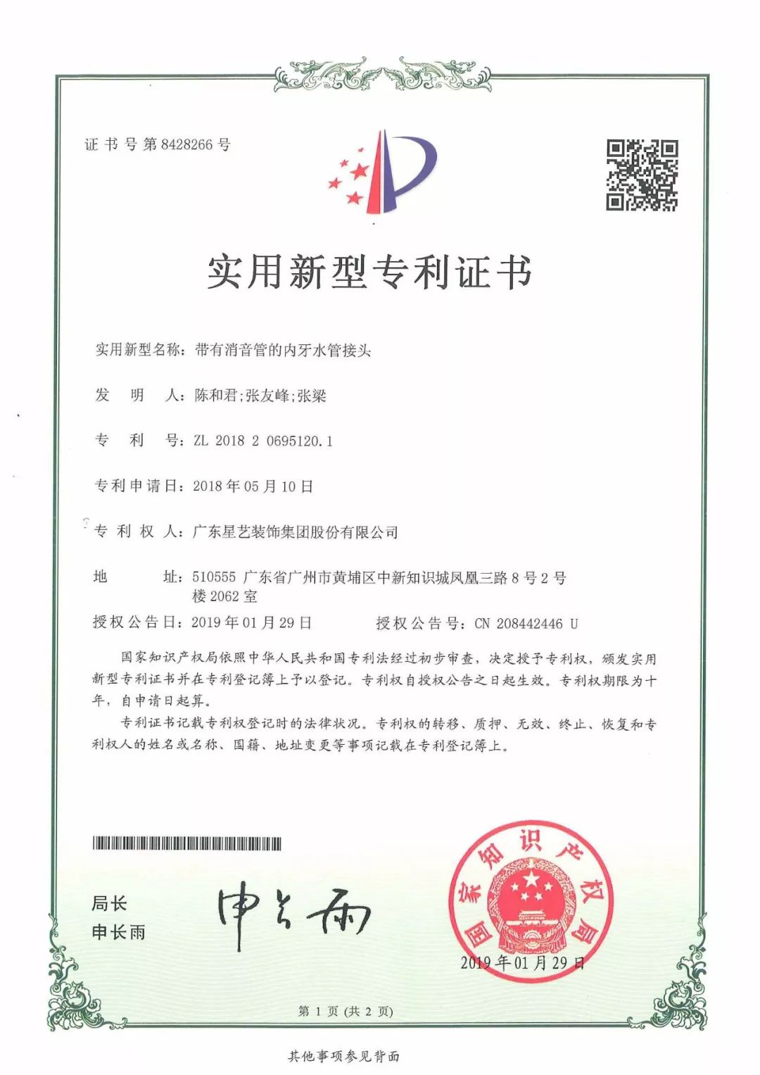 近日,星藝集團(tuán)取得了“帶有消音管的內(nèi)牙水管接頭”實(shí)用新型專利,并獲得了由國家知識產(chǎn)權(quán)局頒發(fā)的專利證書。