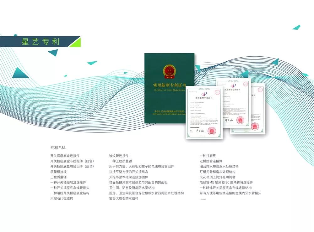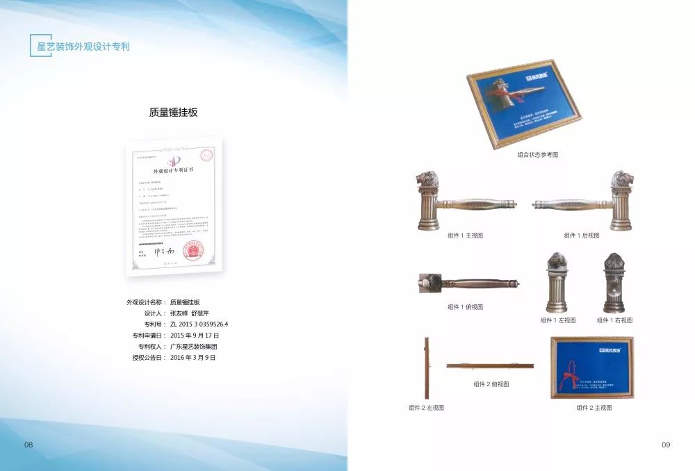 《星藝裝飾專利手冊》收集了星藝裝飾研發(fā)的幾十項(xiàng)國家實(shí)用新型專利和外觀設(shè)計(jì)專利。