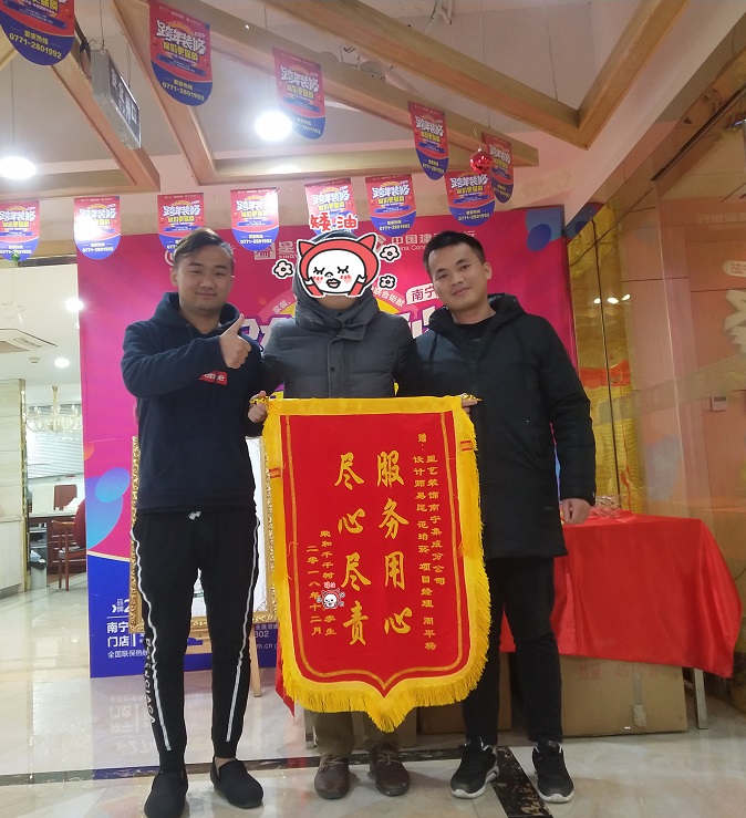 2018年12月,榮和千千樹業(yè)主送來錦旗,稱贊設(shè)計(jì)師易昆、范珀菸專業(yè)設(shè)計(jì),監(jiān)理周平楊服務(wù)用心,盡心盡責(zé)。南寧星藝裝飾全員會繼續(xù)以虔誠、熱情、體貼的態(tài)度和更加務(wù)實(shí)、求精、利他的行動,將“讓每一位客戶滿意”的服務(wù)標(biāo)桿,提升到“讓每一位客戶感動”的新高度,讓客戶省心、省時、省力!