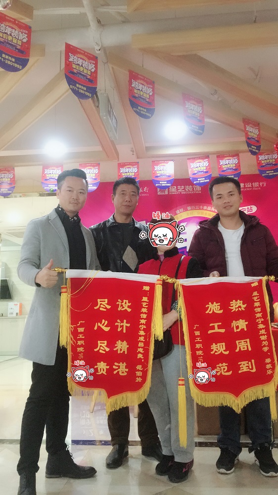 廣西工職院業(yè)主送來錦旗,稱贊設(shè)計(jì)師呂志良、范珀菸設(shè)計(jì)精湛,盡心盡責(zé);監(jiān)理謝為學(xué)、梁敬樂熱情周到,施工規(guī)范。南寧星藝裝飾全員會繼續(xù)以虔誠、熱情、體貼的態(tài)度和更加務(wù)實(shí)、求精、利他的行動(dòng),將“讓每一位客戶滿意”的服務(wù)標(biāo)桿,提升到“讓每一位客戶感動(dòng)”的新高度,讓客戶省心、省時(shí)、省力!