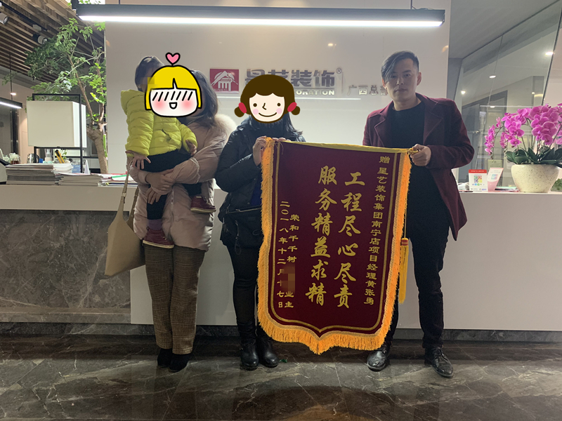 2019年1月22日,星藝裝飾南寧公司項(xiàng)目經(jīng)理黃張勇接受到榮和千千樹業(yè)主業(yè)主的表彰錦旗! 這不是星藝裝飾的第一面錦旗,但也肯定不是最后一面錦旗,紅艷艷的錦旗是星藝裝飾始終堅(jiān)持顧客至上的服務(wù)理念的最好的回報(bào),也是公司不斷發(fā)展、不斷壯大的強(qiáng)勁動(dòng)力。我們將繼續(xù)堅(jiān)持“把裝修交給我們,您放心上班去”的宗旨,全心全意為每一位客戶服務(wù),打造出更多的“放心工程”、“品質(zhì)工程”,來回報(bào)我們的客戶。