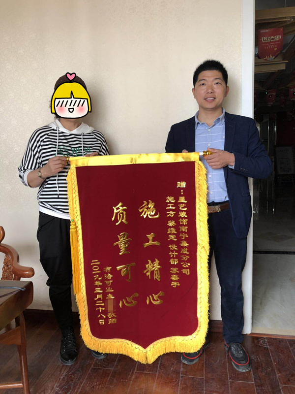 2019年3月28日,嘉和城布洛克業(yè)主為感謝項(xiàng)目經(jīng)理黎維定和設(shè)計(jì)師蘇善宇,專門贈(zèng)送錦旗,錦旗內(nèi)容:質(zhì)量可心 施工精心 。星藝一直堅(jiān)持做裝修等于做朋友的理念,不斷地從設(shè)計(jì)、材料、工程及管理方面進(jìn)行創(chuàng)新、優(yōu)化,走在家裝行業(yè)的前列。