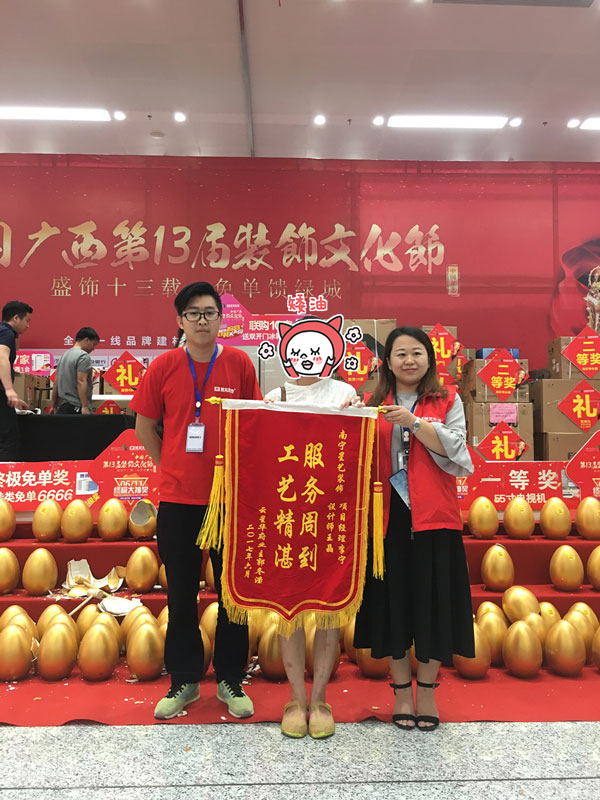 6月9日中國廣西第十三屆裝飾文化節(jié)(南寧站)現(xiàn)場云星華府業(yè)主送來錦旗,感謝設(shè)計(jì)師項(xiàng)目經(jīng)理,工藝精湛,服務(wù)周到。