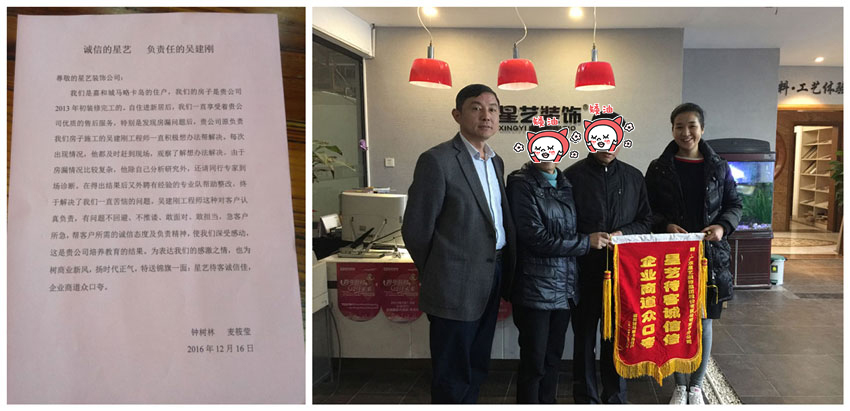 原文內(nèi)容大概如下:業(yè)主的房子是2013年交給星藝裝修的。入住新居后,一直享受星藝專業(yè)的五星售后服務(wù),發(fā)現(xiàn)房漏問題后,我公司項(xiàng)目經(jīng)理吳建剛堅(jiān)持星藝有問題不回避、不推諉、敢面對(duì),敢擔(dān)當(dāng)?shù)脑瓌t,急客戶所急,幫客戶所需的誠信態(tài)度及負(fù)責(zé)精神,業(yè)主深受感動(dòng),故送錦旗給予嘉獎(jiǎng)。附上原文: