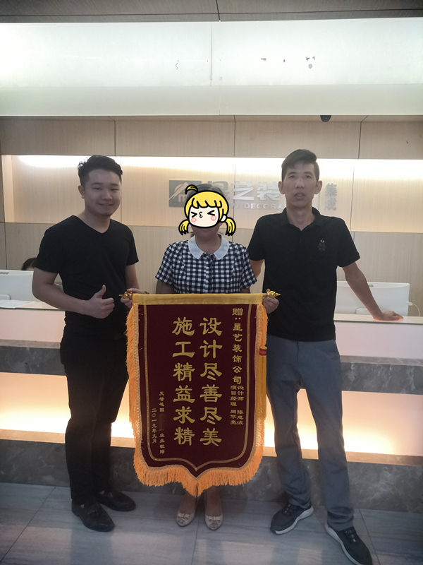 金口碑銀口碑不如業(yè)主的好口碑,獲得客戶的認(rèn)可是所有裝飾企業(yè)的共同目標(biāo)。2019年國(guó)慶前夕,天譽(yù)花園業(yè)主以一面錦旗表達(dá)了他對(duì)星藝裝飾誠(chéng)摯的謝意。設(shè)計(jì)師 陳忠波 項(xiàng)目經(jīng)理周平亮接受錦旗