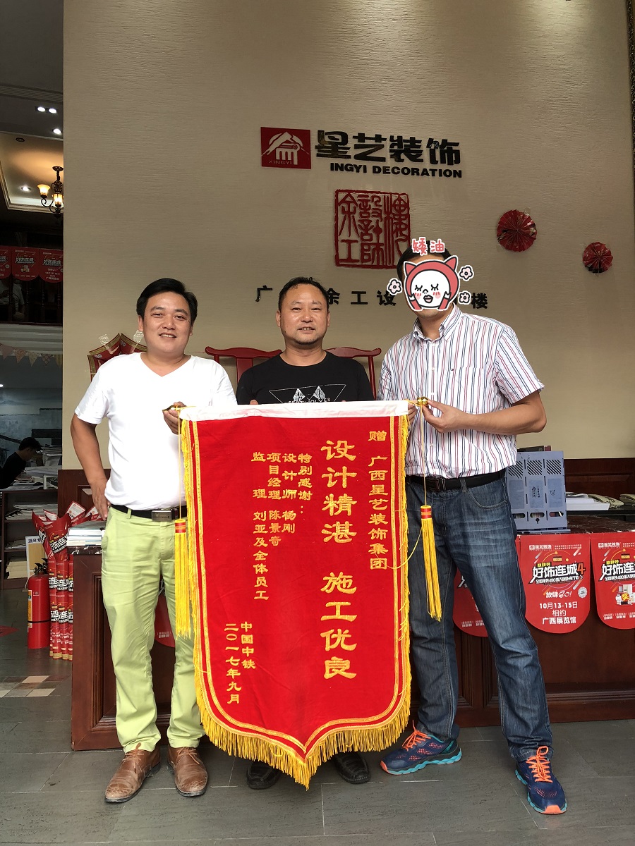 2017年9月29日,中國中鐵送來錦旗,贊揚(yáng)星藝裝飾設(shè)計精湛 施工優(yōu)良,特別感謝設(shè)計師楊剛,項目經(jīng)理:陳景奇,南寧星藝裝飾余工樓設(shè)計總監(jiān)接劉亞接受錦旗。