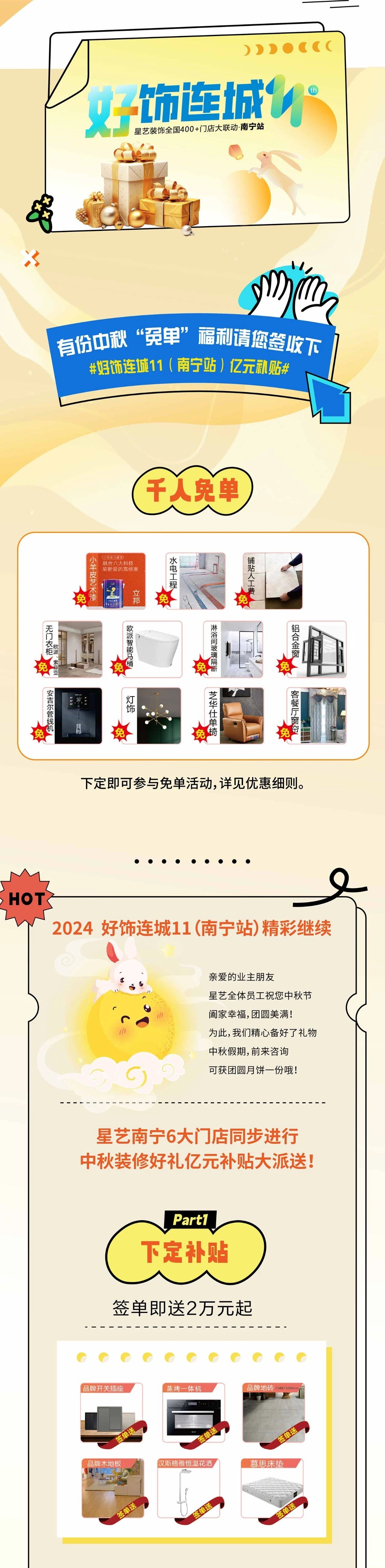 2014年星藝裝飾“好飾連城”全國大聯(lián)動首屆成功舉辦,一年一屆好飾不斷上演。星藝集團(tuán)總部+歐派總部+一線集采品牌助陣聯(lián)合讓利。星藝裝飾33年品牌,入駐綠城22年,不負(fù)每一份信任。好飾連城11,11重禮遇、億元補(bǔ)貼、鉅惠全國。南寧站具體優(yōu)惠如下: