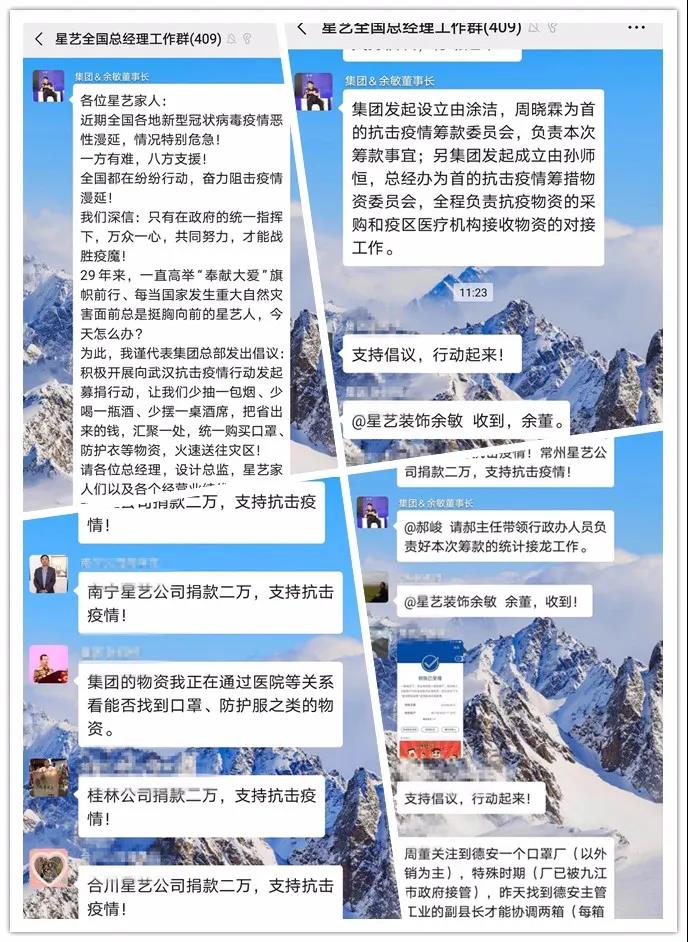 自星藝裝飾“愛心接龍”開啟以來,星藝全國各直營分公司響應(yīng)號(hào)召,積極捐款,有愛的星藝員工也紛紛捐款獻(xiàn)力,并聯(lián)動(dòng)五百多名星藝客戶參與到“愛心接龍”當(dāng)中,齊心奮進(jìn),戰(zhàn)疫情,送溫暖,凝聚起所有一切力量,投入到此次“戰(zhàn)役”……