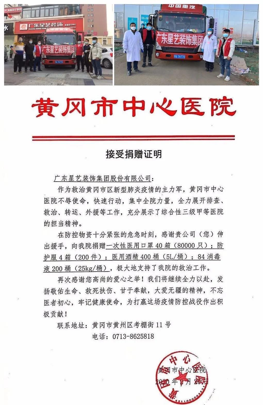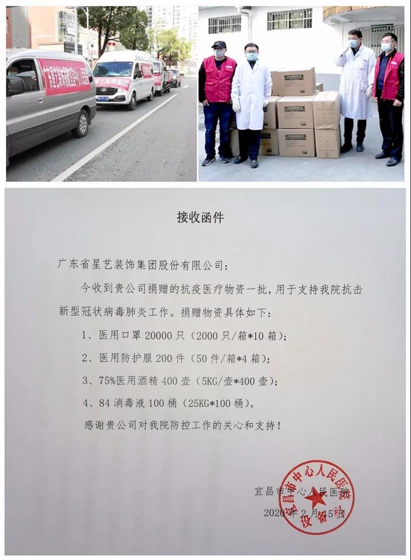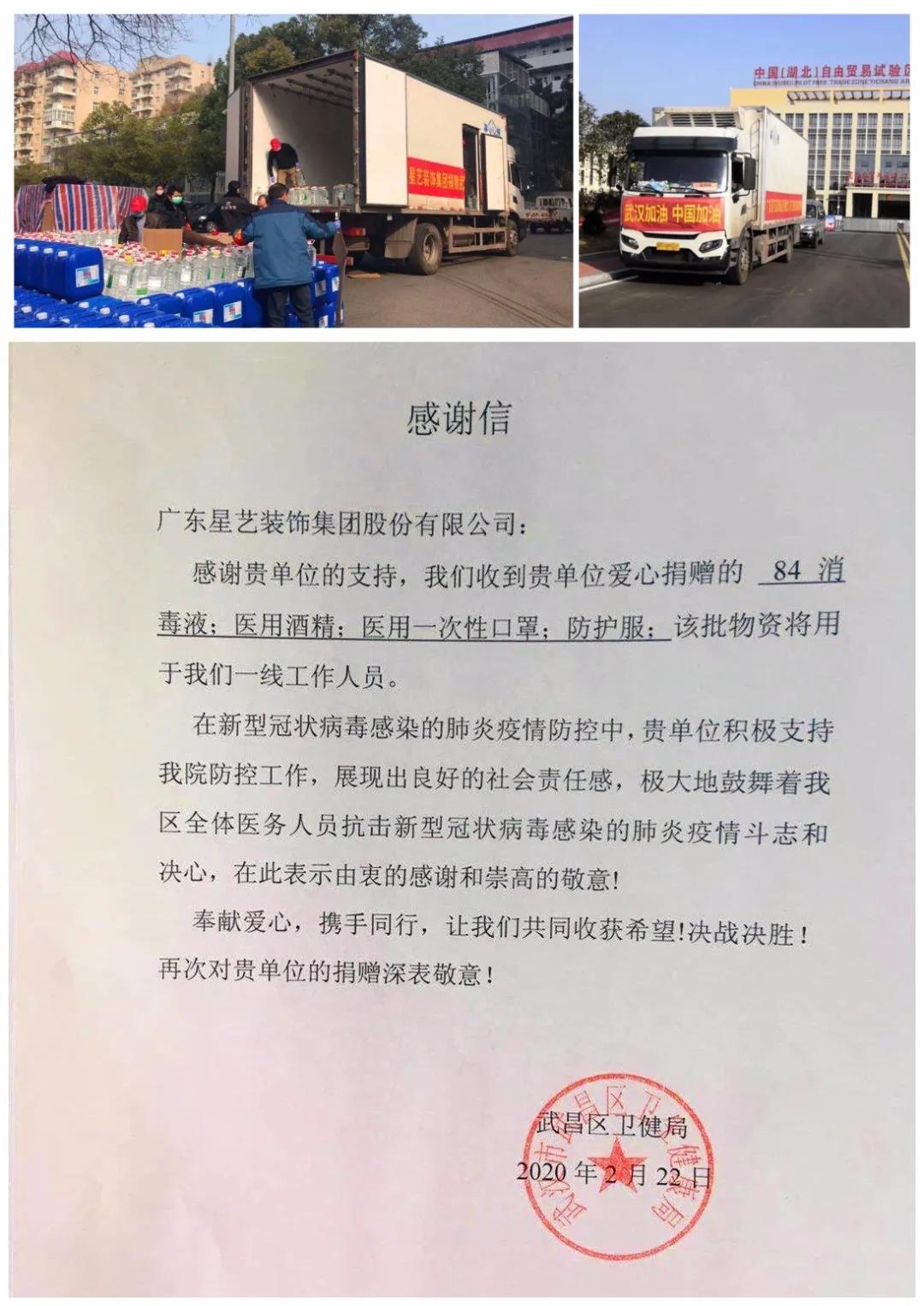 截至2月27日,星藝裝飾“愛心接龍”籌款共計(jì)220多萬元。22日前,通過湖北省慈善總會(huì)協(xié)調(diào),愛心物資分三批向湖北宜昌、武漢、黃岡定向捐贈(zèng)的醫(yī)用口罩、防護(hù)服、醫(yī)用酒精等愛心物資已經(jīng)全部到位,將每份愛心落到實(shí)處。