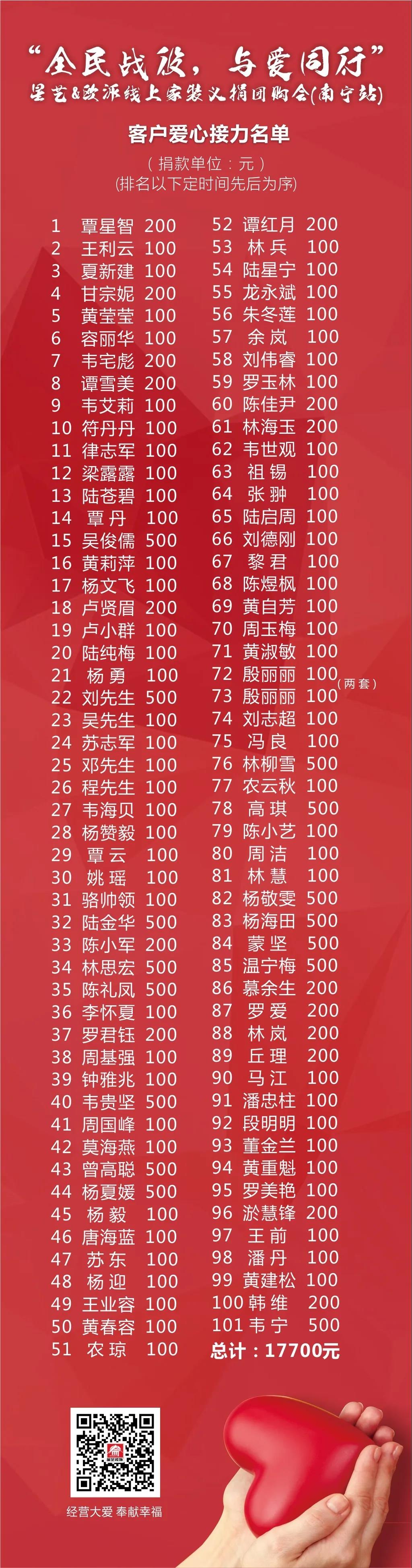 在星藝南寧分公司攜手歐派集團(tuán)通過“開年大飾·與愛同行”線上家裝義捐團(tuán)購惠活動(dòng)中,又獲一百多位客戶信任,加入戰(zhàn)“疫”行動(dòng),經(jīng)過統(tǒng)籌安排,此次客戶的“愛心”將通過星藝集團(tuán)抗擊疫情籌措物資委員會(huì)繼續(xù)向武漢和湖北省內(nèi)疫情嚴(yán)重的地市落實(shí)各項(xiàng)定向捐贈(zèng),本次活動(dòng)“愛心名單”公示如下: