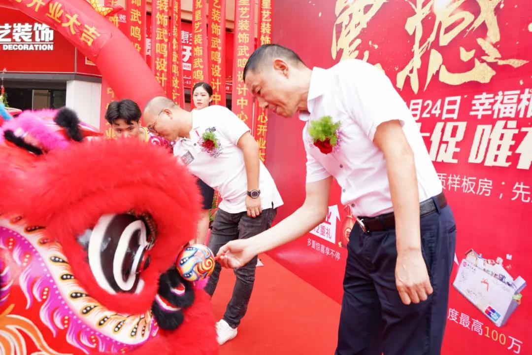 緊接著,集團(tuán)決策委成員、廣西區(qū)域總監(jiān)徐橘,南寧區(qū)域總經(jīng)理周平生上臺進(jìn)行“龍獅點睛”儀式,喚醒“沉睡”的龍獅;隨后,武鳴設(shè)計中心經(jīng)理易槐海,南寧區(qū)域總監(jiān)李明進(jìn)行“接青儀式”,接住龍獅送上的福禮,為南寧星藝裝飾武鳴設(shè)計中心未來的蓬勃發(fā)展送上美好的祝福!