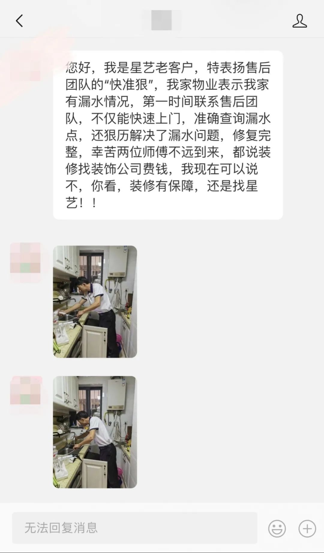 在服務(wù)月期間,有位2016年的老客戶主動(dòng)聯(lián)系我們,經(jīng)過售后部門核對后立即安排工程部項(xiàng)目監(jiān)理周平彬上門為老客戶排查問題,事后客戶十分認(rèn)可星藝裝飾的服務(wù)。 還有在回訪解決完一位榮和山水綠城業(yè)主的廚房問題后,業(yè)主深受觸動(dòng),親自到公司官微留言,贊許星藝裝飾“裝修有保障”。