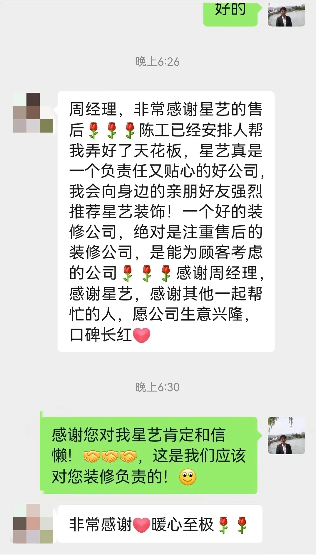 還有位入住業(yè)主在工程部檢修、解決問題后,力贊星藝裝飾是一個“負責任又貼心”、“注重售后的裝修公司”。