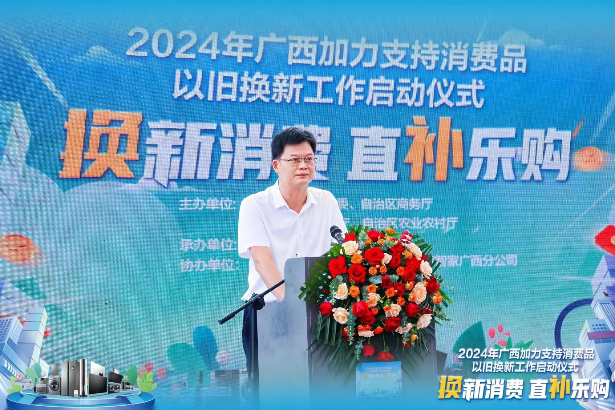 自治區(qū)發(fā)展改革委二級(jí)巡視員李新勤、自治區(qū)發(fā)展改革委環(huán)資處處長(zhǎng)陳彥武、自治區(qū)商務(wù)廳市場(chǎng)運(yùn)行和消費(fèi)促進(jìn)處副處長(zhǎng)顏國(guó)彪、自治區(qū)交通運(yùn)輸廳道路運(yùn)輸發(fā)展中心副主任朱華忠、自治區(qū)農(nóng)業(yè)農(nóng)村廳農(nóng)機(jī)中心副處長(zhǎng)陳雷明、南寧市發(fā)展改革委副主任賀大州、海爾智家廣西分公司總經(jīng)理張迪、南寧百貨大樓股份有限公司總經(jīng)理覃春明參與活動(dòng)并且發(fā)布活動(dòng)致辭。